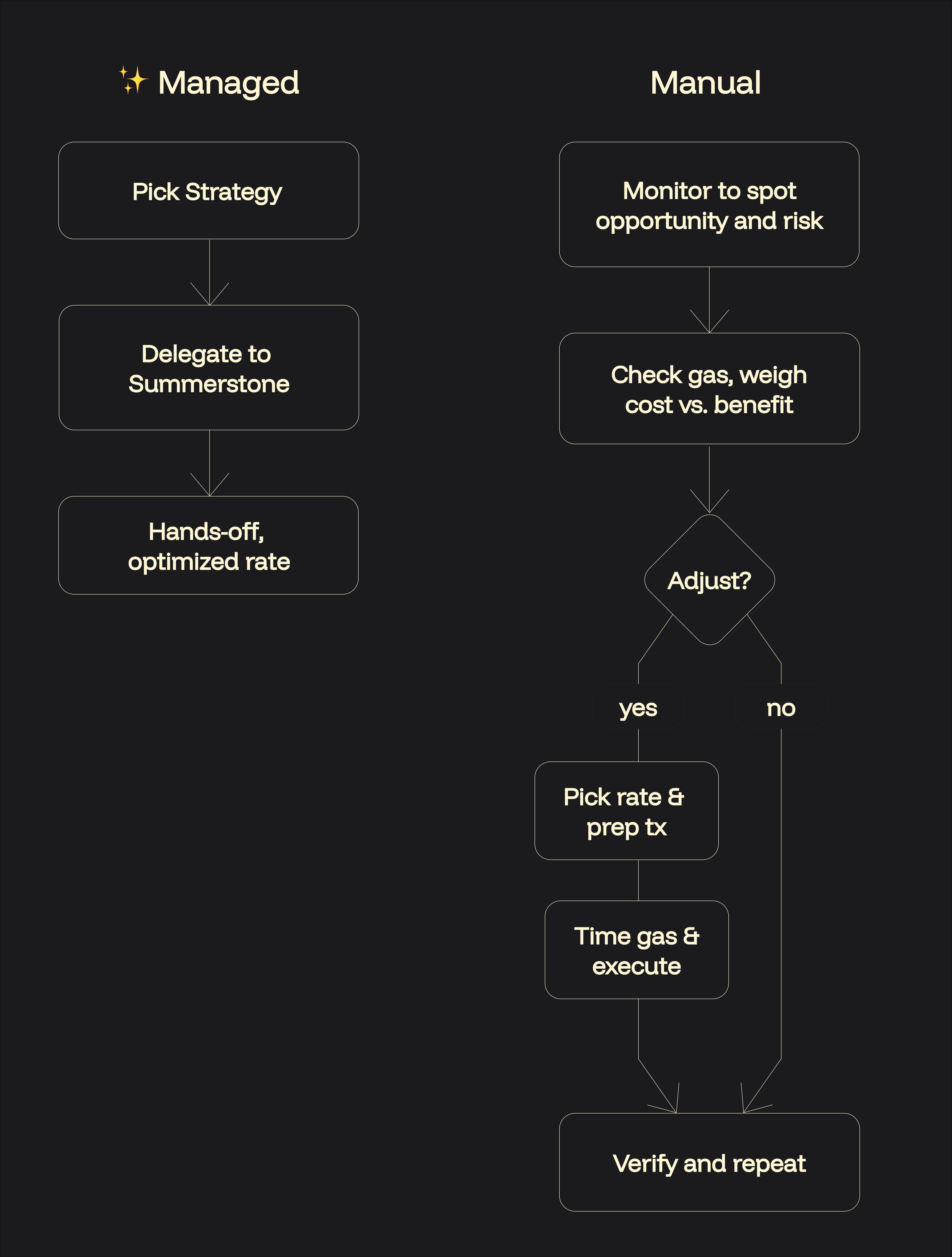 - User remains in control: Delegate only the automation of your interest rate. Summerstone can never take custody or control of your funds.