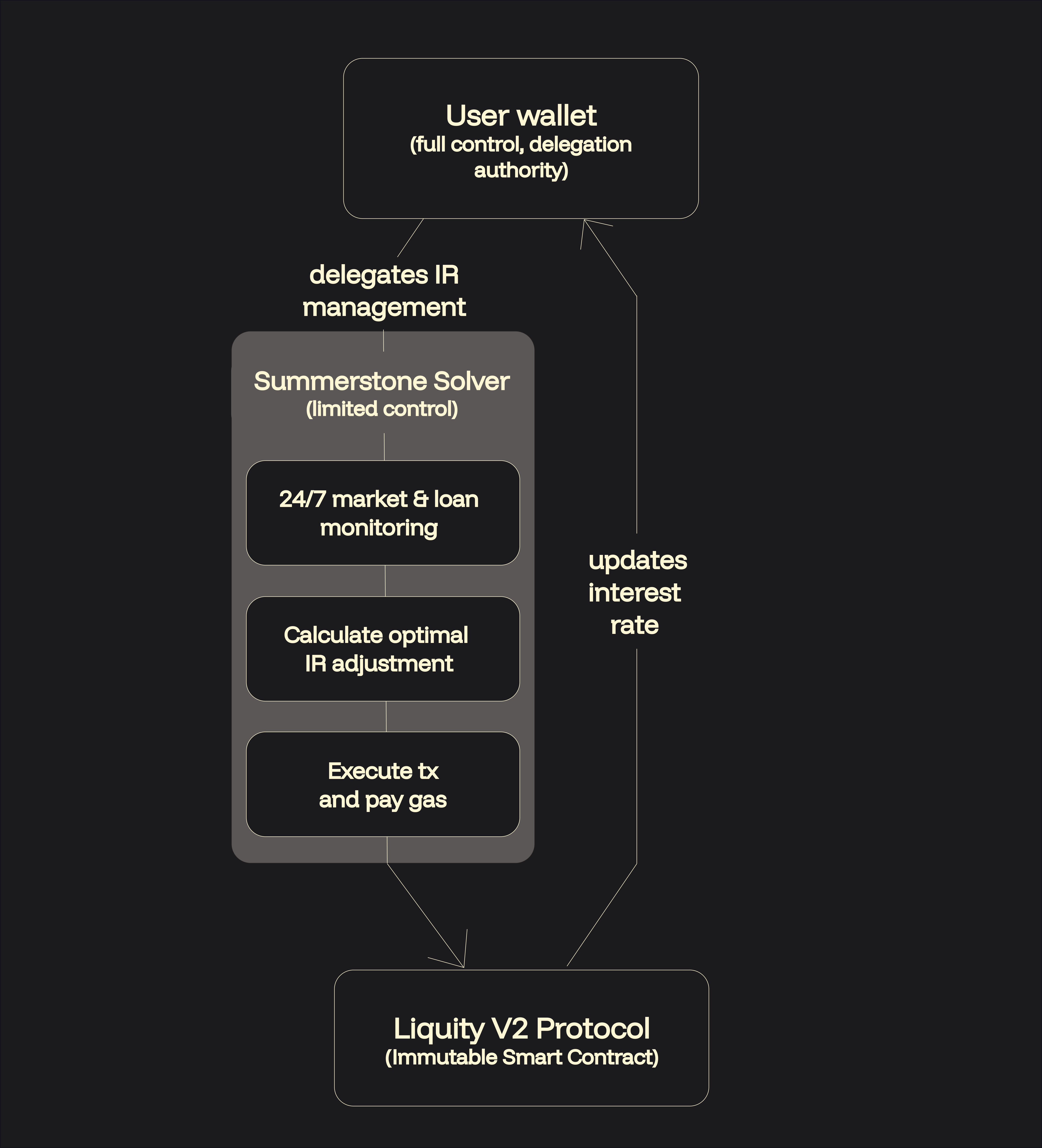 The following diagram illustrates how Summerstone’s automated interest rate management interacts with loans and the Liquity-V2-based protocols: